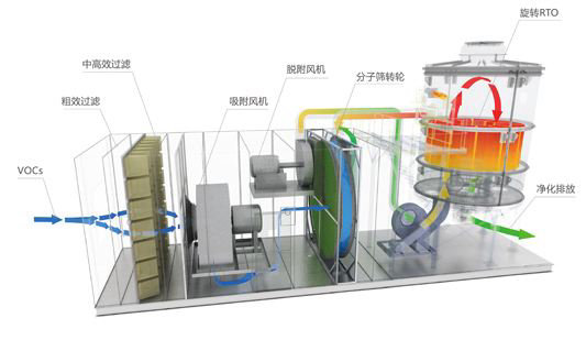 收集廢氣后通過主工藝風(fēng)機的抽吸作用,經(jīng)過干式過濾器前處理進(jìn)行除塵后進(jìn)入轉(zhuǎn)輪,經(jīng)轉(zhuǎn)輪吸附達(dá)標(biāo)后排放至煙囪;脫附氣經(jīng)RTO風(fēng)機進(jìn)入RTO爐,脫附濃縮后的廢氣在RTO氧化反應(yīng)裝置中被加熱至760℃以上,氧化成為CO2和H2O,氧化后的高溫氣體經(jīng)蓄熱體儲存,做為給脫附氣體升溫用,經(jīng)過脫附換熱器的高溫氣體還留有較高溫度可預(yù)留管路作為前方涂膠機烘干箱用。