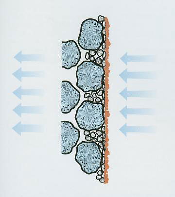 在塑燒濾板的母體基板內(nèi)部,經(jīng)過(guò)對(duì)時(shí)間、溫度的控制燒結(jié)后,會(huì)形成均勻孔隙。然后由樹脂填充表面處理,使孔隙達(dá)到均勻的u級(jí)微孔。獨(dú)特的表面處理不僅只限于濾板表面,而是深入到孔隙內(nèi)部。見圖一。