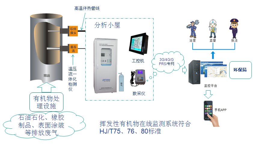 揮發(fā)性有機(jī)物煙氣排放連續(xù)監(jiān)測(cè)系統(tǒng)采用先進(jìn)的全程伴熱預(yù)處理+在線(xiàn)色譜技術(shù)+火焰離子檢測(cè)法(FID),主要應(yīng)用于對(duì)各種工業(yè)污染源排放有機(jī)物的實(shí)時(shí)監(jiān)測(cè),本系列在線(xiàn)氣相色譜分析儀采用國(guó)際先進(jìn)技術(shù),性能穩(wěn)定可靠,自動(dòng)化程度高,檢測(cè)范圍寬,能夠測(cè)量VOCS、總烴(THC)、非甲烷總烴(NMHC)、苯及苯系物等多項(xiàng)參數(shù),對(duì)VOCS的濃度和排放率進(jìn)行連續(xù)、實(shí)時(shí)地跟蹤監(jiān)控,并將所有的監(jiān)測(cè)參數(shù)傳輸至工控機(jī)軟件和用戶(hù)DCS系統(tǒng),可通過(guò)數(shù)采儀與環(huán)保部門(mén)的數(shù)據(jù)系統(tǒng)通訊。系統(tǒng)設(shè)備放置在分析小屋內(nèi),操作和維護(hù)方便,具有現(xiàn)場(chǎng)數(shù)據(jù)實(shí)時(shí)傳送、遠(yuǎn)程故障診斷等功能,實(shí)現(xiàn)了工作現(xiàn)場(chǎng)的無(wú)人值守。整套系統(tǒng)結(jié)構(gòu)簡(jiǎn)單,模塊化設(shè)計(jì),穩(wěn)定性強(qiáng),運(yùn)行成本低。