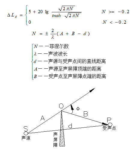 從上式中可以看出,聲屏障的繞射損失完全取決于菲涅爾指數(shù)N,即取決于聲源和受聲點(diǎn)之間的聲程差,聲程差A(yù)+B-d越大,λ聲波波長(zhǎng)越?。l率越高)則聲屏障的繞射損失越大,也就是說(shuō)聲屏障的效果越好。