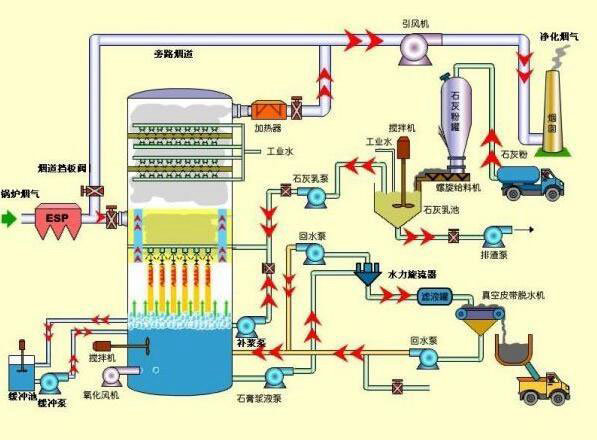 ? ? ? ?石灰石-石膏濕法脫硫工藝采用價廉易得的石灰石作脫硫吸收劑。將石灰石粉與水混合攪拌制成石灰石漿液,石灰石漿液經(jīng)泵打入吸收塔與煙氣充分接觸,使煙氣中的二氧化硫與漿液中的碳酸鈣進行反應生成亞硫酸鈣,從吸收塔下部漿池鼓入氧化空氣使亞硫酸鈣氧化成硫酸鈣,硫酸鈣達到一定飽和度后,結(jié)晶形成二水石膏。從吸收塔排出的石膏漿液經(jīng)濃縮、脫水,使其含水量小于10%,然后用輸送機送至石膏貯倉堆放。脫硫后的煙氣經(jīng)過除霧器除去霧滴后,由煙囪排入大氣。