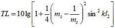 其中TL是消聲量,單位dB, ms=S2/S1=S2/S3稱為消聲器擴張比,l2為擴張室長度。S1、S3為管道截面積,S2擴張室截面積。