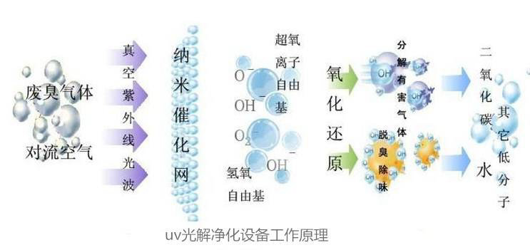 特制UV紫外線燈:利用特制的高能高臭氧UV紫外線光束照射廢氣,裂解工業(yè)廢氣如:氨、硫化氫、甲硫氫、甲硫醇、甲硫醚、乙酸丁酯、乙酸乙酯、二甲二硫、二硫化碳和苯乙烯,硫化物H2S、VOC類,苯、甲苯、二甲苯的分子鏈結(jié)構(gòu),使有機或無機高分子惡臭化合物分子鏈,在高能紫外線光束照射下,降解轉(zhuǎn)變成低分子化合物,如CO2、H2O等。利用高能高臭氧UV紫外線光束分解空氣中的氧分子產(chǎn)生游離氧,即活性氧,因游離氧所攜正負電子不平衡所以需與氧分子結(jié)合,進而產(chǎn)生臭氧。 UV+O2→O-+O*(活性氧)O+O2→O3(臭氧),眾所周知臭氧對有機物具有極強的氧化作用,對工業(yè)廢氣及其它刺激性異味有效果。工業(yè)廢氣利用排風設備輸入到本凈化設備后,凈化設備運用高能UV紫外線光束及臭氧對工業(yè)廢氣進行協(xié)同分解氧化反應,使工業(yè)廢氣物質(zhì)其降解轉(zhuǎn)化成低分子化合物、水和二氧化碳,再通過排風管道排出室外。利用高能-C光束裂解工業(yè)廢氣中細菌的分子鍵,破壞細菌的核酸(DNA),再通過臭氧進行氧化反應,達到凈化及殺滅細菌的目的。