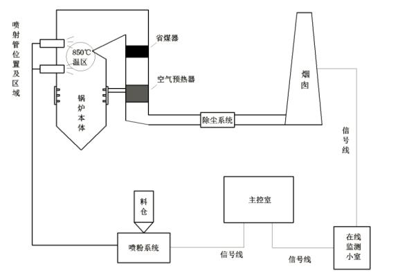此工藝采用的脫硝劑為高分子活性物窯爐煙氣脫硝劑,并以其“投資少,效果好,安裝簡(jiǎn)單,運(yùn)行成本低”等特點(diǎn)被迅速推廣應(yīng)用。該技術(shù)是采用粉體輸送設(shè)備將其——高分子活性物脫硝劑噴入爐膛或者煙道溫度在850℃的溫度區(qū)域,被高溫氣化后,與煙氣中的NOx化學(xué)反應(yīng),還原成N2/H2O和硝酸鹽顆粒物。同時(shí)可根據(jù)企業(yè)煙氣排口安裝的連續(xù)在線(xiàn)監(jiān)測(cè)系統(tǒng),監(jiān)測(cè)出的數(shù)據(jù)和企業(yè)的排放指標(biāo),采用PID自動(dòng)控制系統(tǒng)控制試劑用量大小,達(dá)到脫硝的目的。